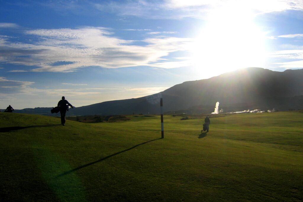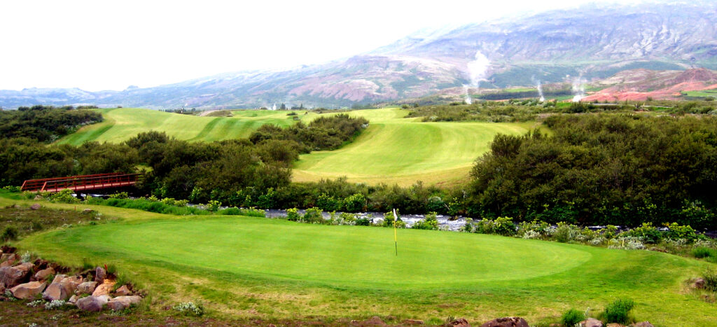 Golfskálinn er vel staðsettur með fallegt útsýni yfir Haukadalsvöll ásamt útsýni yfir hverasvæðið á Geysi þar sem sjá má Strokk gjósa reglulega.